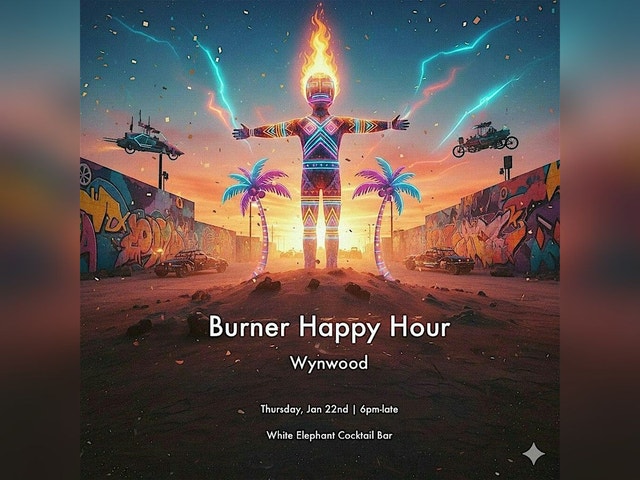 BURNER HAPPY HOUR Dust off your goggles and find your favorite faux fur—the road to the Playa (and Virginia Key) starts here. With just two weeks until we head to Love Burn, it’s time to gather the community at the White Elephant Cocktail Bar for a night of radical inclusion and pre-event magic. Whether you’re a seasoned veteran packing your bins or a curious newcomer looking to find your first camp, come connect with the local community before we head to the sand. The Vibe: * 🎶 Playa Beats: Soundscapes provided by DJs from some of your favorite Miami Theme Camps. * 🍸 Liquid Courage: Crafted cocktails and elixirs from the White Elephant team. * 🤝 Communal Effort: Swap advice, meet your campmates, and share the hype. The Details: * When: Thursday, January 22nd * Time: 6:00 PM – Midnight * Where: White Elephant Cocktail Bar, Wynwood * Wear: Your favorite burner flair is always encouraged, but never required. No ticket? No problem. Even if you aren't making it to Love Burn this year, come down to soak up the energy and meet the people who make the Miami burner scene so special.