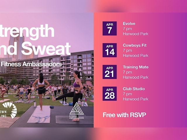 STRENGTH & SWEAT SERIES AT HARWOOD PARK Free Community Workout Series with Downtown Dallas Inc. + Fitness Ambassadors Join us at Harwood Park every Tuesday in April for the Strength & Sweat Series, a free outdoor fitness series designed to bring the Downtown Dallas community together through movement. Each week features a different top Dallas trainer delivering a high-energy, all-levels workout β followed by a post-sweat social with local vendors, brand activations, and community connection. Come for the workout. Stay for the community. EVENT DETAILS * π Location: Harwood Park * ποΈ Dates: Tuesdays in April * β° Class Time: 7:00 PM * π Check-In Opens: 6:30 PM * π Parking: Free street parking after 6 PM | Garage parking at Jackson & Harwood * π What to Wear: Athletic clothes and tennis shoes * π§ What to Bring: Yoga mat (rentals available for $5 via Venmo, Zelle, ApplePay) * πΈ Follow & Tag: @fitnessambassadorshq | @downtown_dallas APRIL 2026 LINEUP * April 7 β Priscilla Esquivel- EVOLVE Dallas * April 14 β Jackie Brown - Cowboys Fit * April 21 β Adrian Hinkle - Training Mate * April 28 β Club Studio Dallas (Trainers subject to change.) WHAT TO EXPECT + WHATβS INCLUDED * 45-minute, all-levels outdoor workout * Rotating Dallas trainers each week * High-energy community atmosphere * Post-class social in the park * On-site vendors and brand activations * Sparkling energy drinks from Bubblr * Hydration from Electrolit * Sun care from CeraVe & La Roche-Posay * Goodies from Groove, Kindling Snacks, Dude Wipes, Hustle Clean, and more RAIN PLAN If weather becomes an issue, updates will be sent via email and social channels as needed. FRIENDLY REMINDER This is a free community event. If you RSVP and are unable to attend, please cancel at least 48 hours in advance so others can plan accordingly. Make Tuesday nights your new favorite way to move downtown. πͺπ
