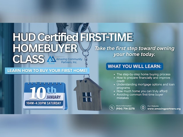 HUD Certified First-Time Homebuyer Class ā FREE Ready to take the first step toward owning your home? Join our HUD Certified First-Time Homebuyer Class and gain the knowledge and confidence you need to navigate the homebuying journey successfully. In this comprehensive class, you will learn: * The step-by-step homebuying process * How to prepare financially and improve your credit * Mortgage options and available loan programs * How much home you can truly afford * How to avoid common first-time buyer mistakes This class is HUD certified, making it ideal for first-time buyers who may need certification for down payment assistance or special loan programs. š Date: Saturday, January 10 ā° Time: 10:00 AM ā 4:30 PM š Location: 1773 N. State Road 7, Lauderhill, FL 33313 š² Cost: FREE (Registration required) Seats are limited. Register today and start your journey to homeownership with confidence!