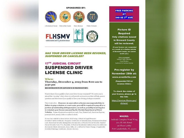 Suspended Driver License Clinic Welcome to our Suspended Driver License Clinic! If you're dealing with a suspended license and need help navigating the process to get back on the road, this event is for you. Join us for a day filled with information, resources, and experts ready to assist you in understanding what steps to take next. Don't miss this opportunity to potentially get your driver's license reinstated! Our in-person clinic is designed to answer your questions, provide guidance, and help you work towards resolving your license suspension. Take the first step towards getting back behind the wheel - we're here to support you!