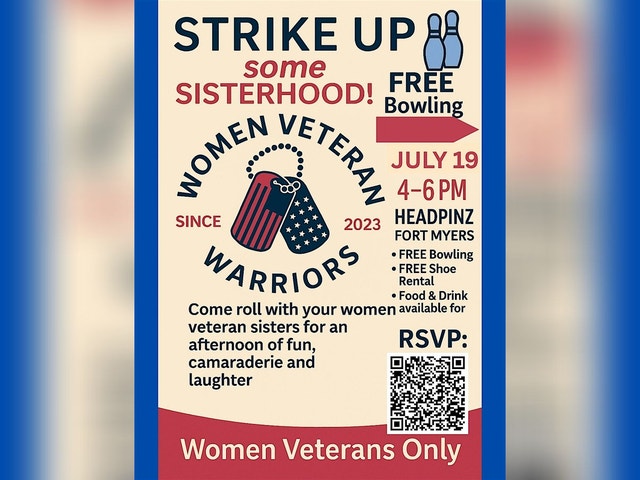 Women Veteran Warriors Bowling Night π³πΊπΈ STRIKE UP SOME SISTERHOOD! πΊπΈπ³ WOMEN VETERAN WARRIORS BOWLING NIGHT π Date: Thursday, July 18 π Time: 4:00 PM β 6:00 PM π Location: HEADPINZ FORT MYERS π₯ This event is for Women Veterans ONLY β FREE Bowling β FREE Shoe Rental π Food & Drinks available for purchase Come roll with your sisters-in-arms for an afternoon of fun, laughter, and connection! Whether youβre a bowling pro or just here for the good vibes, youβre welcome on our team. πͺ RSVP required As space is limited β bring your military pride and join us! ππ³π #WomenVeteranWarriors #WomenVetsUnite #BowlingWithTheBrave #SisterhoodInService #Womenareveteranstoo #Womenveteranwarriors #servicesacrificesisterhood Come join us for a fun-filled evening at HeadPinz Fort Myers! This event is exclusively for women veterans to come together, bond, and enjoy a night of bowling. Whether you're a pro bowler or just looking to have a good time, this event is for you. Show off your skills, make new friends, and celebrate the warrior spirit within each of us. Don't miss out on this opportunity to connect with fellow women veterans in a relaxed and welcoming environment. Let's roll some strikes and have a blast!