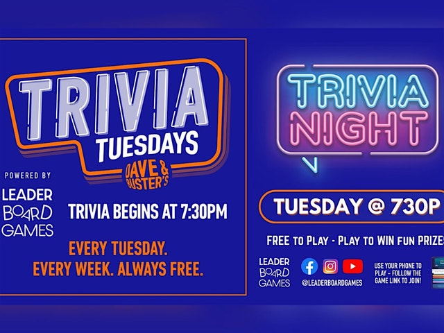 Join us for an exciting Trivia Night and fun at Dave & Buster's - Killeen TX every Tuesday at 730p! Put your knowledge to the test and compete against fellow trivia enthusiasts in our action-packed trivia game event. Free to Play but you have to Play to WIN! Play an interactive trivia game, with a competitive mix of questions, including image round and music round. Hosted live by a super fun Game Host, with competitive trivia format. Use your phone to play along, submit answers and get points. Check out the Leaderboard throughout the game to see how you rank. Prize for the lucky winners! Get ready to flex your brain muscles as our energetic trivia host guides you through a series of mind-boggling questions spanning various topics, including pop culture, sports, history, science, and more. Whether you're a seasoned trivia buff or just looking for a great time with friends, this event is perfect for you! Gather your team of up to six players and strategize together to maximize your chances of winning. Engage in friendly banter and heated discussions as you work your way towards the top spot. Remember, the more brains, the better! Join us for a night of friendly competition, laughter, and unforgettable memories at Dave & Buster's Tuesday Trivia game night! #TriviaNight #GameNight #BrainpowerBattles #TriviaFun #TriviaGameNight #TestYourKnowledge #FriendlyCompetition #FunAndGames #trivia #freetoplay #trivianight #GoodTimes #FunWithFriends #leaderboardgames #triviagame #prizes #winprizes #davebusters #daveandbusters #Killeen #tx #texas #freetoplay #leaderboardgames