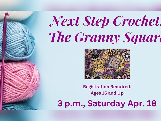 In this program, you’ll learn the basics of creating a traditional granny square and learn about different ways granny squares can be used, from making blankets to clothing to bags. Registration begins Apr. 4 and is limited to 24 participants ages 16 and up. Attendees will need to bring their own crochet hooks, size G or H. Attendees must know how to create a slip knot, chain, slip stitch, and single crochet. Our library programs are free and in high demand. If you register and can no longer attend, please cancel your reservation at least 24 hours in advance so we can accommodate others. Repeated no-shows may affect your ability to register for future events.