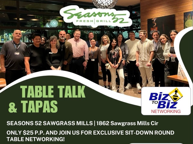 EXCLUSIVE TABLE TALK & TAPAS NETWORKING AT SEASONS 52 SAWGRASS MILLS MALL SUNRISE SEASONS 52 at the Sawgrass Mills Mall 1862 Sawgrass Mills Circle - Sunrise MONDAY, May 18th from 5:30-7:30pm EXCLUSIVE NETWORKING - TABLE TALK & TAPAS Join Biz To Biz Networking in West Broward for Exclusive Networking at Seasons 52 in Sunrise! You won't want to miss this Networking Event This is not your typical stand-up Networking Event. This is an elevated Round Table Experience making this a more intentional and meaningful way to connect. $25 Admission Tickets Online at www.biztobiznetworking.com Includes: Entry to this Exclusive seated Networking event. One Drink Ticket - Wine or Beer TAPAS on Each Table includes a Selection of Flatbread stype appetizers, slow roasted meatballs, grilled artichoke's with preserved Lemon hummas. Limited Seating - First 40 Call For Sponsorship Opportunity Call 954.838.9644 - $150 View All of Biz To Biz Networking Events: www.biztobiznetworking.com