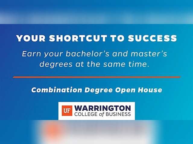 UF UNDERGRADUATE STUDENTS! GET A HEAD START ON YOUR GRADUATE EDUCATION. Combination degree programs [https://masters.warrington.ufl.edu/uf-combination-degrees] allow UF undergraduate students to get a head start on their graduate education and work towards a bachelor’s and master’s degree at the same time. Deadline to register is November 12, 2025! This open house provides an insider’s look at the benefits of a Combination Degree. Hear directly from students and our full-time staff about what it takes. Food will be provided. RSVP is required. Space is limited. Check-in begins at 6:00 pm. Get there early to get your seat and food! WHEN IT COMES TO SCHOOL, TIME IS MONEY. Save both time and money by pursuing your bachelor’s and master’s at the same time, while also securing your competitive edge as you prepare for success outside of the classroom. BUSINESS COMBINATION DEGREES: * Entrepreneurship * Finance * Finance & Technology * Information Systems & Operations Management * International Business * Management * Marketing * Real Estate LEARN MORE WITH AN INFORMATION SESSION. Discover more about your Combination Degree of choice by attending one of our individual program information sessions. Register for an info session today [https://warrington.ufl.edu/graduate/#info-sessions]!