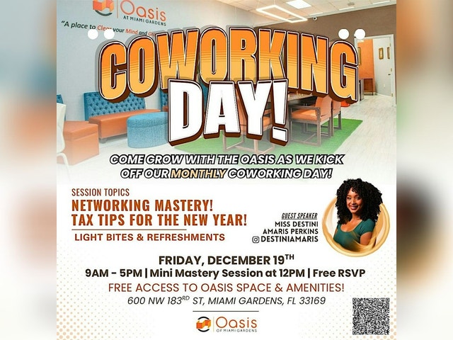 COME BY ANY TIME BETWEEN 9 AM TO 5 PM ON DECEMBER 19TH! Recharge your productivity, build real connections, and level up your networking skills — all in one inspiring space! 🌱💼 Join us at Oasis at Miami Gardens for the kickoff of our new Monthly Co-Working Day Series — a free day of community, creativity, and focused work. Entrepreneurs, remote workers, small business owners, and professionals are invited to enjoy complimentary access to our coworking space along with WiFi, lunch, and a power-packed mini learning session. 💡 12:00 pm Mini Session: “Mastering Networking in Person and Digitally for Entrepreneurs” Learn how to build meaningful connections, elevate your digital presence, and create more opportunities for your business with Destini Amaris Perkins. ✨ WHAT’S INCLUDED * 🧑💻 Free coworking space for the day * 🚀 High-speed WiFi * 🍽️ Complimentary lunch * 🤝 Mini Networking Masterclass at 12:00 pm * 🌟 Meet fellow entrepreneurs & professionals * 💬 Supportive, creative community energy 🎯 WHO SHOULD ATTEND Entrepreneurs • Small Business Owners • Remote Workers • Creatives • Freelancers • Students • Professionals looking to connect and grow Come get work done, learn something new, and make meaningful connections at The Oasis at Miami Gardens.