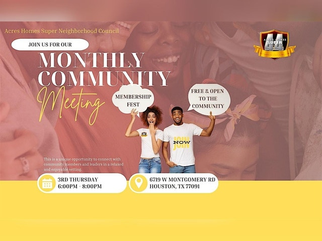 Welcome to the Acres Homes Super Neighborhood Council Monthly Meeting! Join us at the Acres Homes Multi-Service Center for our monthly gathering. This is a great opportunity to connect with your neighbors, voice your concerns, and contribute to the betterment of our community. At the meeting, we will discuss upcoming events, community projects, and ways to improve our neighborhood. Your participation is crucial in shaping the future of Acres Homes, so don't miss out! Mark your calendar and come prepared to share your ideas and insights. Together, we can make a difference in our community. See you there!