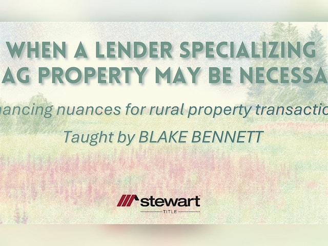 When a Lender Specializing in Ag Property May Be Necessary CE Course Number: 48915 Credit Hours: 1 If you work with rural or agricultural properties, this class is a must. Rural land deals aren’t just “normal deals with more acreage”. The lending rules are different, and missing one detail can put your entire transaction at risk late in the process. You’ll learn how to spot agricultural lending red flags early, understand lender requirements, and know when a specialized ag lender is truly necessary. This knowledge helps you protect your clients, your commission, and your reputation by keeping deals from falling apart weeks before closing. Instructed by Dr. Blake Bennett