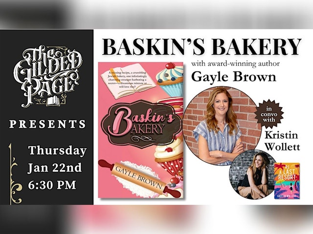 Join us on Thursday, January 22nd at 6:30 PM as we welcome award-winning author Gayle Brown to celebrate her latest release, Baskin's Bakery, a delicious romantic comedy about second chances, secret recipes, and finding the courage to follow your heart. Gayle will be in conversation with Kristin Wollett, author of As a Last Resort. Books will be available for preorder or during the event. Signing line to follow the talk. PREORDER A COPY OF THE BOOK HERE. [https://thegildedpagebookstore.square.site/product/baskin-s-bakery-by-gayle-brown/7HDIKGJINEFC54SDAI7F4T3Y?cp=true&sa=false&sbp=false&q=false&category_id=M7ESVQEKFUOSCOG4BRLHWX4H] About the book: A missing recipe, a crumbling Jewish bakery, and one infuriatingly charming stranger harboring a secret--is it a disastrous mixture, or will love rise? With her grandmother's treasured rugelach recipe missing, twenty-six-year-old Seraphina Baskin needs to keep her family's famous Jewish bakery afloat. But there's just one problem: a black thumb plagues Seraphina. She can't bake anything without burning, melting, or otherwise destroying every batch. Enter David Winslow, a charming stranger who makes Seraphina's heart soften like dough and stomach fold like warm batter. Desperate for help and against her better judgment, Seraphina hires him, their chemistry heating more than just the kitchen. But as sabotage threatens the bakery, secrets rise like over-proofed dough. Faced with David's hidden truth, Seraphina must decide if opening her heart is the missing ingredient kneaded to whip up a happy ending. About the author: Formerly a full-time teacher, now a full-time writer, Gayle’s passion for writing started when she could hold a crayon in her hand, using the walls as her storyboard. Since then, she’s connected pen to paper and fingers to the keyboard at every given chance. Gayle is also a mentor for the writing program, The Book Incubator. She is a member of various writing organizations, including Women’s Fiction Writing Association, International Women’s Writing Guild, International Thriller Writers, and Sisters in Crime. When not writing, mentoring or reading, you can find her spending time with her family, including a very spoiled mini-dachshund, in Florida.