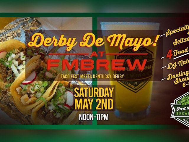 Taco Fest Meets Kentucky Derby at FMBrew and you’re invited to the fiesta! Doors open at noon, and we’ve got four incredible food trucks serving up their unique specialties: King’s Tacos & Burritos, Dynamite Street Eatz, Ro & Co Barbecue, and Don’t Give Up. Come hungry, because the flavors are going to be next level.DJ Nate keeps the party going from 2–6pm , then saddle up for Dueling Pianos from 6–9pm, where audience participation isn’t just encouraged, it’s expected. Don your fanciest derby hat, bring your requests, and your best energy!Sip on specialty beers , refreshing Seltzer Ritas , and Spyk’d Slushies all day long. It’s free to attend, so grab your friends, place your bets, and come hungry and thirsty. The fiesta kicks off at noon — it’s Taco Fest Meets Kentucky Derby!