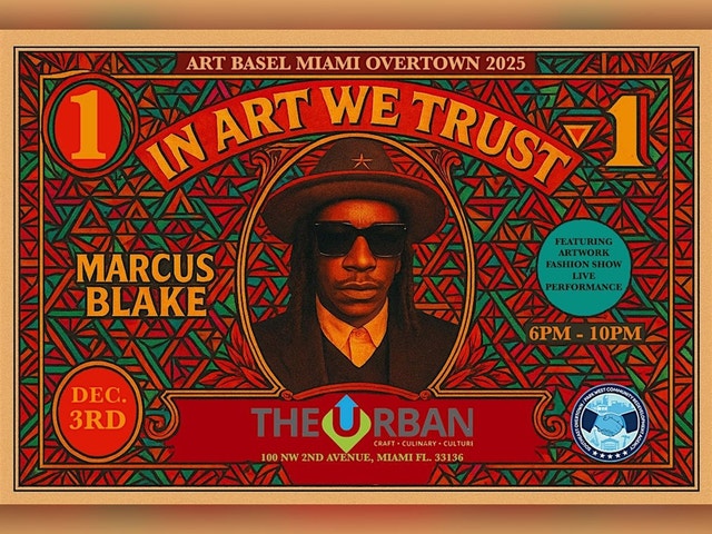 In collaboration with The Urban Miami for Art Basel 2025, Marcus Blake presents In Art We Trust — a high-energy fusion of art, fashion, and live performance. Experience Blake’s newest artwork, the debut of his latest ATINRA collection, and vibrant musical performances that bring the night to life. A celebration of creativity, culture, and community — all under one unforgettable Miami skyline.