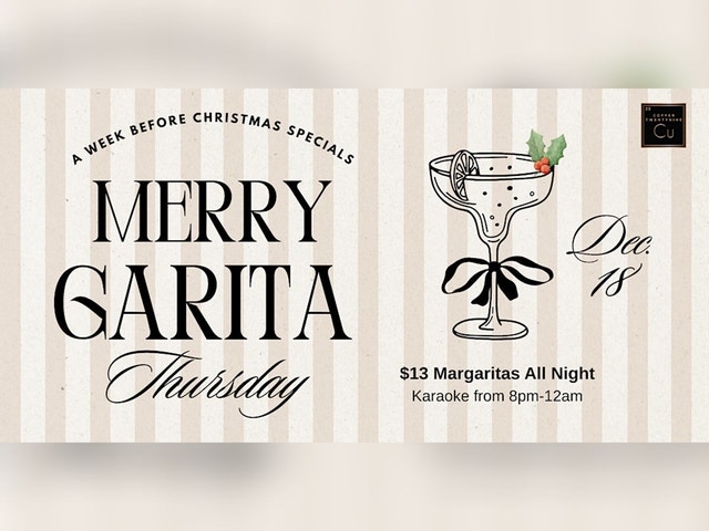 Kick off The Week Before Christmas at Copper 29 Bar with Merry Garita Thursday 🎄🍸 a brand new holiday night featuring karaoke and $13 margaritas. From 8 pm to 12 am, take the stage, cheer on the crowd, and enjoy our signature margaritas while the music keeps the energy high. Bring your friends, pick your songs, and make this the start of your holiday celebrations. Order a margarita, grab the mic, and turn Thursday into a night worth talking about!