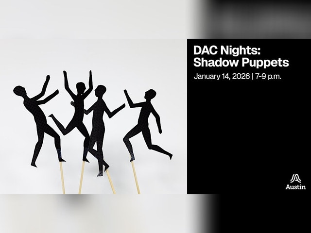 Experience the magic of simple creativity and storytelling at DAC Nights: Shadow Puppets! Participants will build shadow puppets using a variety of materials, crafting characters of all shapes and sizes to tell fantastical tales or create whimsical decorations. Guided by DAC Nights Staff, explore the performance of shadow puppets against a glowing backdrop on the DAC Theater stage. You’ll walk out at the end of event with puppets and a simple walkthrough for setting up puppet shows to take the adventures of your newfound friends home with you. This event is free! Registration is encouraged, but not required. For more information about this event, email DACTheater@austintexas.gov The City of Austin is committed to compliance with the Americans with Disabilities Act. Reasonable modifications and equal access to communications will be provided upon request. For assistance please contact (512) 974-3917 or Relay Texas 7-1-1. For more information or to request a language interpreter, please call Austin 3-1-1 or 512-974-2000. Requests for interpretation services should be made at least five days prior to the meeting or event you plan to attend.