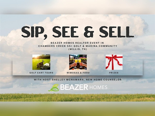 SIP, SEE & SELL REALTOR EVENT Sip, See & Sell- New Year, New Homes! Food, Mimosas & Networking as Beazer Homes reveals our Gatherings move-in-ready current inventory, with generous incentives! Golf cart tours of Chambers Creek 55+ Community & Gift drawings! This is a multi-sponsored event, RSVP NOW to enjoy the fun! SPONSORS: Chambers Creek, Guild Mortgage-Woodlands, Caring Transitions, Lagniappe Pools. Event details subject to change. See a New Home Counselor for details. ©2025/2026 Beazer Homes