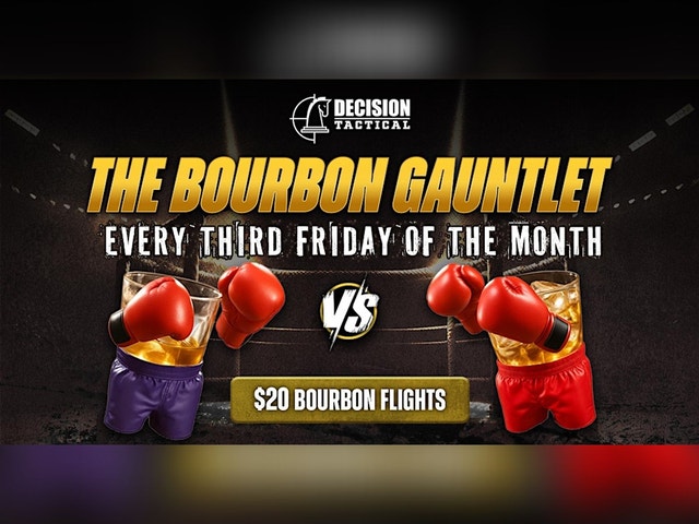Only $20 for the full flight. Taste, compare, and vote for your favorite! Join us every third Friday of the month for Bourbon Night with new competitors, great company, and a champion to crown. Free to RSVP - Pay at Venue Decision Tactical – Where good taste meets good aim.