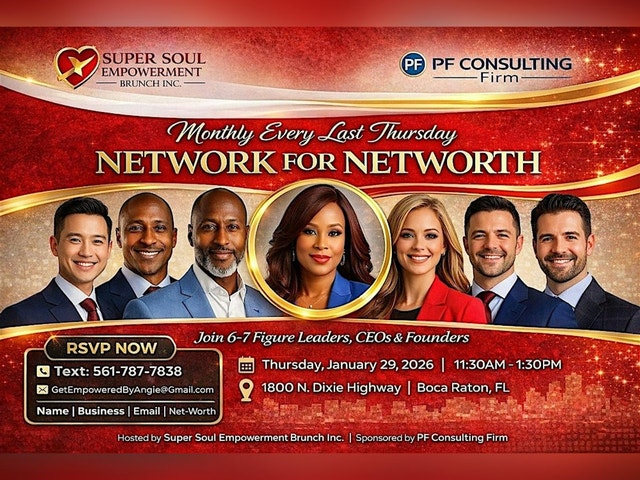 Network for NetWorth is a high-level business networking experience designed for professionals who understand that who you connect with matters. Hosted by Super Soul Empowerment Brunch Inc. and sponsored by PF Consulting Firm, this monthly event brings together accomplished leaders, CEOs, founders, and professionals who are intentional about growth, collaboration, and long-term success. This is not casual networking. It is a curated environment where meaningful conversations, strategic relationships, and real opportunities are created. WHAT TO EXPECT * A room filled with driven, growth-minded professionals * High-level conversations and intentional networking * Opportunities to connect with potential partners, clients, and collaborators * A professional, welcoming environment designed for relationship-building * A strong start to 2026 with clarity, focus, and community WHO THIS EVENT IS FOR * 6–7 Figure CEOs, Founders & Entrepreneurs * Business Owners & Executives * Attorneys, CPAs & Accountants * Physicians, Nurse Practitioners & Healthcare Providers * Realtors, Brokers & Finance Leaders If you value quality connections, strategic conversations, and being in the right room — this experience is for you. WHY ATTEND Your next opportunity, client, partnership, or idea may come from one conversation. Network for NetWorth is designed to put you in proximity to people who think, build, and lead at a higher level.