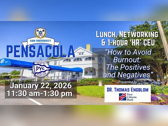 Join us for a fabulous complimentary lunch at The Pensacola Yacht Club and hear from Thomas Engblom with First Citizens Bank as he presents a 1-hour 'HR' CEU: "How to Avoid Burnout: The Positives and Negatives." Get your CEU, network with business partners, and have a fantastic lunch! 11:30 am - 1:30 pm