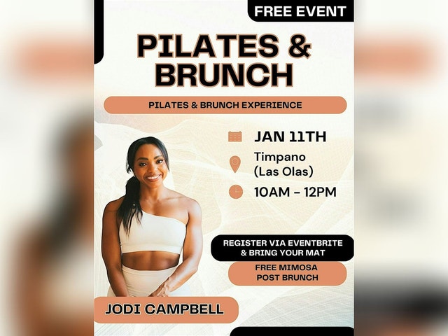 Pilates & Brunch Come join us for a fun morning of movement, live Djing and delicious food at Timpano Las Olas! Our Pilates & Brunch event is the perfect way to start your day with a workout followed by a tasty meal. Get ready to sweat it out with a Pilates workout led by Jodi Campbell, and then refuel with an incredible brunch spread. Whether you're a Pilates pro or a newbie, this event is suitable for all levels. Enjoy community, movement, local vendors, live DJing. Don't miss out on this fantastic opportunity to treat yourself to some self-care and good eats!