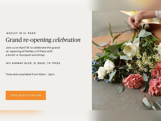 Sign up for a free flower bouquet-making workshop by local vendor Blossom Bar , and come join our El Paso Ashley Grand Re-Opening celebration! * Saturday, April 18th | 10 am to 2pm | 1411 Airway Blvd. El Paso, TX 79925 * The first 20 people in line for the Grand Re-Opening receive a FREE pair of Apple AirPods 4! Get there by 10 am! * For one day only! Up to 25% off your in-store purchase * Over $4000 in giveaways and hourly prizes – including an electric bike! * Come enjoy music, refreshments, and fun for the whole family! Please note: signing up for a workshop on Eventbrite does not guarantee a spot at the event. Workshop spots are first-come, first serve. We will honor Eventbrite signups first every hour, then open remaining slots to other event guests after 30 minutes. If you are not able to get a worshop spot on Eventbrite, please come in-person as there is a high likelihood you will still get in on event day! We hope to see you there! ______________________________________________________________ ¡Taller de Ramos de Flores en la Tienda Ashley de El Paso, TX - Evento de Gran Reapertura! ¡Ven a crear un ramo de flores y descubre la tienda Ashley renovada en El Paso, TX! ¡Regístrate para un taller gratuito de creación de ramos de flores con el proveedor local Blossom Bar, y únete a nuestra celebración de Gran Reapertura de Ashley en El Paso! Esto es lo que puedes esperar: * ¡Las primeras 20 personas en la fila recibirán un par de Apple AirPods 4 GRATIS! ¡Llega antes de las 10 am! * Hasta 25% de descuento en toda tu compra en la tienda** * Más de $4000 en sorteos y premios cada hora -- ¡incluyendo una bicicleta eléctrica! * ¡Ven a disfrutar música, bebidas y diversión para toda la familia! * ¡Por un día solamente, ahorros exclusivos de gran reapertura que no querrás perderte! Por favor ten en cuenta: registrarse para un taller en Eventbrite no garantiza un lugar en el evento. Los espacios para el taller son por orden de llegada. Honraremos primero las inscripciones de Eventbrite cada hora, y luego abriremos los espacios restantes a otros invitados del evento después de 30 minutos. Si no puedes conseguir un espacio para el taller en Eventbrite, ¡por favor ven en persona ya que hay una alta probabilidad de que aún puedas participar el día del evento! ¡Esperamos verte allí! ______________________________________________________________ NO PURCHASE NECESSARY. Open to citizens or lawful permanent residents of the U.S., residing full-time within a 20-mile radius of the El Paso, TX Ashley store. Further restrictions apply based on the applicable promotion. Enter from 10 AM local El Paso time through 2 PM local time on April 18, 2026 during the store’s Grand Re-Opening event. Sweepstakes are subject to Official Rules; for a copy of the Official Rules or more information on the promotions, visit https://www.ashleyfurniture.com/coupons-deals-and-offers/.