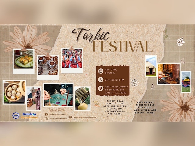 Welcome to the Turkic Festival! Come join us on Sat, April 25, 2026 at Raindrop Foundation San Antonio for a day filled with delicious food, live music, folk dance and vibrant art performances. Experience the rich heritage of the Turkic (Azerbaijan, Kirgizistan, Kazakhstan, Turkmenistan, Turkiye, and Tajikistan) people through traditional decorations, art displays, and interactive workshops. Indulge in mouthwatering Turkic cuisine, shop for unique handicrafts, and mingle with fellow festival-goers. Whether you're a long-time fan of Turkic culture or just looking for a fun, family-friendly weekend activity, the Turkic Festival promises a memorable experience for all. Don't miss out on this exciting event - mark your calendars and get ready to immerse yourself in the beauty of the Turkic world!