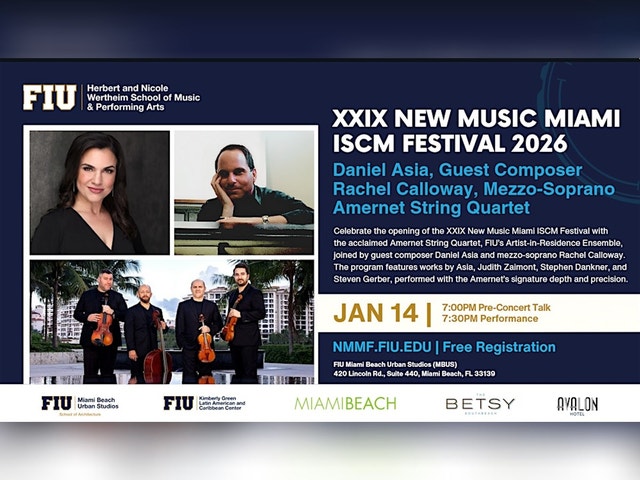Join us for the opening of the XXIX New Music Miami ISCM Festival, led by Artistic Director Orlando Jacinto Garcia, with the acclaimed Amernet String Quartet, FIU’s Artist-in-Residence ensemble, joined by Tucson-based composer Daniel Asia and mezzo-soprano Rachel Calloway for an unforgettable evening of contemporary chamber music. Hailed for performances of “immense intelligence and deeply satisfying precision,” the Amernet is recognized as one of America’s finest ensembles, captivating audiences across Europe, Asia, and the Americas with their rich, expressive sound. This special opening night features compelling works by Daniel Asia, Judith Zaimont, Stephen Dankner, and Steven Gerber—a powerful collection of contemporary voices spanning lyrical, contemplative, and boldly rhythmic sound worlds. Asia, whose music ranges from intimate chamber works to expansive symphonic writing, brings his distinctive artistic vision and decades of critical acclaim to the program, further elevated by Calloway’s expressive vocal artistry. Don’t miss this remarkable start to the festival—a rare opportunity to experience world-class musicians bringing vibrant new chamber music to life in the heart of Miami’s cultural scene. The festival is presented by the FIU Wertheim School of Music & Performing Arts, with support from the City of Miami Beach, the Kimberly Green Latin American and Caribbean Center at Florida International University, FIU Miami Beach Urban Studios, and The Betsy South Beach Hotel and The Betsy Writers Room. The Avalon Hotel Miami Beach on Ocean Drive is the official host hotel for the festival.
