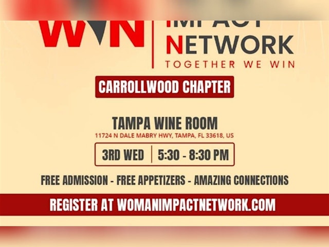 WELCOME TO THE WOMEN IMPACT NETWORK CARROLLWOOD CHAPTER EVENT! Come join us at Tampa Wine Room on September 17, 2025 at 10:00 AM (Eastern Time) for am afternoon illed with inspiration, networking, and empowerment. This is a fantastic opportunity to connect with like-minded women in your community and make meaningful connections. Whether you are a seasoned professional or just starting your career, this event is for you! Get ready to be motivated by our guest speakers, engage in thought-provoking discussions, and build lasting relationships. Don't miss out on this incredible event! Mark your calendars and get ready to be a part of something special. We can't wait to see you there! LADIES ONLY