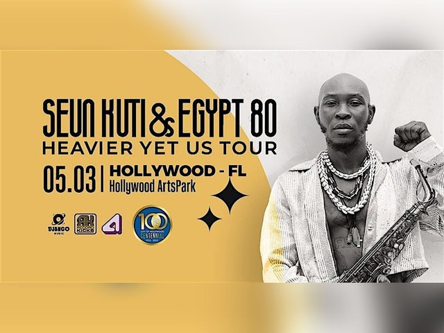 Afrobeat star Seun Kuti is a Nigerian musician, singer, and songwriter renowned for his captivating performances and socially conscious music. He is the youngest son of the legendary Fela Kuti. Seun is preserving and extending his father’s political and musical legacy as the leader of Fela's former band Egypt 80. As a developing saxophonist and percussionist, Seun entered the formal ranks of the band before he was 12. When Fela passed in 1997, in fulfilment of his father’s wishes, Seun assumed the mantle as head of Egypt 80 and he has run it ever since - a funk-groove polyphonic power house of horns, percussion, afrobeat guitars, and dancers.His newly released album follows 2018’s Grammy-nominated ‘Black Times’, and was executive produced by Lenny Kravitz and Fela's original engineer Sodi Marciszewer. It features special guests Damian Marley and Sampa The Great, plus the massive power of Egypt 80. Seun Kuti and the 9-member Egypt 80 are playing in Hollywood FL as part of the US tour that also includes a date at Coachella Festival. The opening set features the popular Miami-based funk-jazz-hip hop ensemble FOOM! This concert is presented FREE to the public, produced by Rhythm Foundation with the support of the City of Hollywood, and made possible with support from the Broward County Cultural Division.
