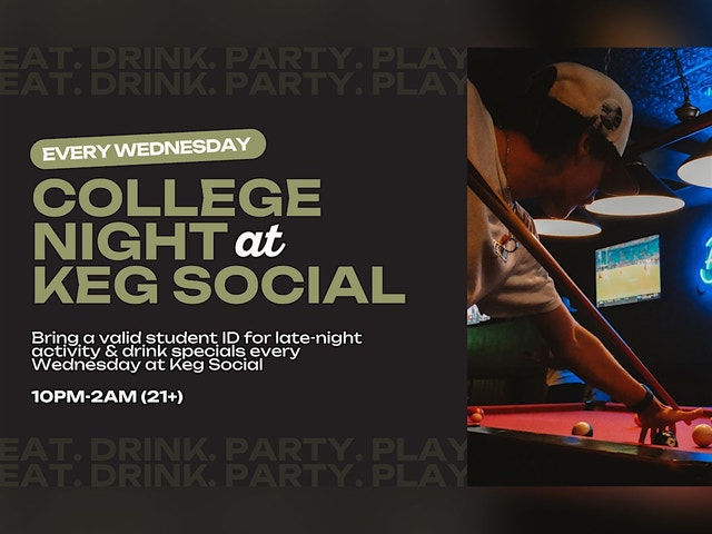Don't miss out on the College Night fun at Keg Social Orlando! Join us EVERY Wednesday from 10:00PM-2:00AM(21+) for all the fun. Enjoy $10 UNLIMITED bowling, half off activities (with valid student ID), and select cocktail and shot deals! Guest DJ from 10PM-2AM 12850 Waterford Lakes Pkwy, Orlando, FL 32828