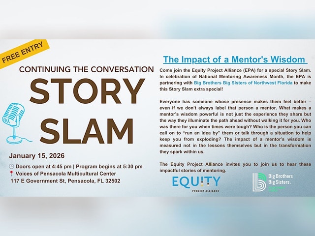 The Impact of a Mentor's Wisdom Come join the Equity Project Alliance (EPA) for a special Story Slam. In celebration of National Mentoring Awareness Month, the EPA is partnering with Big Brothers Big Sisters of Northwest Florida to make this Story Slam extra special! Everyone has someone whose presence makes them feel better – even if we don’t always label that person a mentor. What makes a mentor’s wisdom powerful is not just the experience they share but the way they illuminate the path ahead without walking it for you. Who was there for you when times were tough? Who is the person you can call on to “run an idea by” them or talk through a situation to help keep you from exploding? The impact of a mentor’s wisdom is measured not in the lessons themselves but in the transformation they spark within us. The Equity Project Alliance invites you to join us to hear these impactful stories of mentoring.