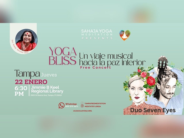 Te invitamos a un viaje musical a través del sistema nervioso para alcanzar un estado meditativo donde nos volvemos uno con el universo que nos rodea—silenciosos y llenos de dicha. El dúo internacional Seven Eyes, formado por la cantante británica Tanya Wells y el guitarrista brasileño Paulo Vinícius, crea un puente musical entre Oriente y Occidente, entre la poesía y la melodía, entre la tradición y la innovación. Con un repertorio que abarca desde música clásica y jazz hasta canciones y composiciones originales inspiradas en diversas culturas, este proyecto se ha convertido en un punto de encuentro para audiencias de todo el mundo. La voz expresiva de Tanya Wells—formada en la música india y su ornamentación detallada—se entrelaza con la virtuosidad y elegancia de la guitarra de Paulo Vinícius, sustentada en su sólida trayectoria como intérprete y compositor entrenado en prestigiosas instituciones europeas. Juntos han actuado en Europa, Asia y las Américas, cautivando al público con conciertos que combinan belleza, emoción y una conexión artística inconfundible. Seven Eyes no solo interpreta música; te invita a sumergirte en una experiencia sensorial de meditación donde cada nota cuenta una historia y cada silencio respira significado. Su propuesta es un viaje que celebra la diversidad, la sutileza y el poder universal de la música para unir culturas y corazones. Nota: El concierto está patrocinado por Sahaja Yoga Meditation y es gratuito para el público. LUGAR: Jimmie B Keel . Regional Library Dirección: 2902 W Bearss Ave, Tampa, Fl 33618 FECHA Y HORA: Jueves 22 de enero. 6:30 PM – 7:30 PM Reserva tu entrada gratuita. Cupos limitados. ⭐ ¿POR QUÉ MEDITAR? Cuanto más meditamos, más paz sentimos en nuestro interior. Así de simple—y Sahaja Yoga Meditation hace que esta experiencia sea fácil de alcanzar. Produce un poderoso e instantáneo estado de conciencia sin pensamientos, donde la mente se calma y la paz fluye por el cuerpo, brindando una conciencia espiritual transformadora. Para facilitar esta experiencia meditativa, Sahaja Yoga Meditation presenta el concierto YOGA BLISS: UN VIAJE HACIA LA PAZ INTERIOR, donde la música y el arte nos guían hacia la meditación y el comienzo de nuestro viaje espiritual. El dúo internacional Seven Eyes utiliza la música y el arte para elevarnos y conectarnos con nuestro ser interior. Todos los artistas que participan practican Sahaja Yoga Meditation en su vida diaria, y esta cualidad se refleja en su arte. ⭐ SHRI MATAJI NIRMALA DEVI Fundadora de Sahaja Yoga Meditation Nacida en una dinastía real en la India, Shri Mataji conoció a Mahatma Gandhi cuando era niña y vivió en su ashram. Más tarde se convirtió en estudiante de medicina, luchadora por la libertad, querida madre, abuela, bisabuela y esposa de un distinguido diplomático. Durante más de cuatro décadas, Shri Mataji viajó por el mundo para llevar paz a quien quisiera aprender, sin importar religión, raza o condición social. Nunca cobró por compartir su conocimiento y siempre dijo que uno no puede pagar por su propia evolución. Si deseas, puedo corregir estilo, adaptar el tono, hacerlo más breve o convertirlo en un flyer.