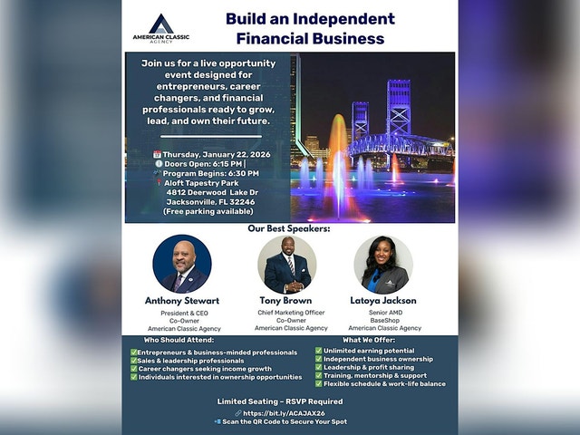 ACA BUSINESS OPPORTUNITY -JACKSONVILLE, FL 2026 Get ready for an exciting in-person event in the heart of Jacksonville! Dive into amazing business opportunities with ACA, connect with like-minded folks, and explore what 2026 has in store. Whether you're starting out or looking to expand, this event is your chance to shine. Don't miss out on the fun and learning—see you there!