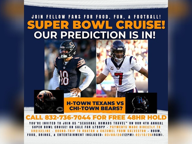 Welcome to the 4th Annual Super Bowl Cruise!* Prepare to set sail on the Regal Princess cruise ship for an unforgettable experience. Join us from February 08th, 2026 at 12:00 pm until February 15th, 2026 at 09:00 am as we set sail round-trip from Galveston, TX to the islands of Roatan and Cozumel with Princess Cruises! Don't miss out on food, fun, and football. Yell and scream at the 22-foot mega screen with fellow fans... all on the high seas. Seasonal Nomads Travel Agency is hosting our 4th Annual Super Bowl Cruise! You can watch the game from the pool, the bar, the theater, or a lounge chair, options are endless! On sale for $799 a person, including accommodations, unlimited food, drinks, and entertainment for 7 nights! Makes a great Valentine's surprise! No passport is needed. Instructions to Join our Group: #1: Request your no money down hold via Eventbrite tickets. #2. Call our travel agency to specify cabin type or learn more: 832-736-7044 #3. Receive your booking confirmation from our agency by email. #4. Pay the deposit on your courtesy hold through us or directly to Princess at 800-774-6237. (Our Princess Group #TN0) Thank you and see you onboard! - Seasonal Nomads Travel facebook.com/seasonalnomadstravel | seasolanalnomadstravel@gmail.com | instagram.com/seasonalnomadstravel
