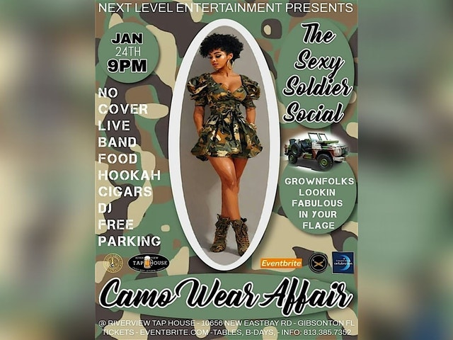 We droppin a bomb on the city !!!! SOMETHING DIFFERENT !! SOMETHING BRAND NEW TO THE BAY…..WE CALLING ALL THE NO LIMIT GROWNFOLKS FOR THE FIRST “SEXY SOLDIER SOCIAL” The Mature Adults CAMO WEAR AFFAIR !!! THIS CHARITY EVENT IS SATURDAY JAN 24TH. ITS TIME TO PUT THE "FUN" IN FUNDRASING & GET READY FOR WAR in your military outfits !!! THIS EVENT IS ONLY FOR THE FASHION FORWARD THE INDIVIDUALS WHO CAN DO SOMETHING DIFFERENT WITH THEIR WARDROBE!!! THIS EVENT IS ONLY FOR THE CHIC & SEXY SOCIALITES OF THE BAY AREA!!!! THIS EVENT WILL BE FILLED WITH BAY AREA TRENDSETTERS, TASTEMAKERS AND TAMPA PROFESSIONALS!!!! FEATURING LIVE MUSIC, AMAZING DJ, FREE ENTRY, GREAT FOOD, HOOKAH, CIGARS & SEXY VIBES & FREE PARKING - This amazing venue IS SOMETHING YOU will definitely enjoy. THE OFF THE CHAIN DJ SET will keep you dancing all night !!! and the rnb singer will take you back and have you singing your lungs out !!! YOUR SHOE GAME, HAIR, NAILS, WARDROBE, FRESH CUT, PERFUME, AND COLOGNE ALL MUST BE ON POINT !!! GO GET THAT NEW ARMED FORCES OUTFIT OR PRESS UP YOUR SECRECT WEAPON THATS BEEN WAITING PATIENTLY IN YOUR CLOSET !! THIS EVENT WILL BE HELD AT RIVERVIEW TAP HOUSE !!! located at 10656 NEW EASTBAY DR. GIBSONTON FL. Get ready for the OG GENERALS & THE LOVELY LADY LUTENIENTS lookin fabulous in your flage !! GUARANTEED FUN, ONLY GROWN FOLK & MATURE ADULT DESTINATION FOR THE CLASSY CLIENTELE. YOU AND YOUR CREW WILL LOVE THE ATMOSPHERE !! Don’t get caught behind enemy lines !!! COME ON OUT AND DISCOVER WHAT WILL BE AN UNFORGETTABLE military theme affair - ALL FOR SICKLE CELL AWARENESS !! FOR TABLES, B DAYS & MORE INFO PLEASE CONTACT 813.385.7352