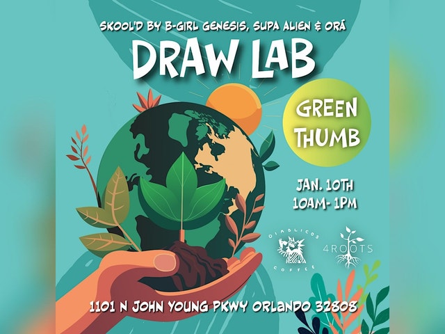 DRAW LAB ORLANDO: GREEN THUMB EDITION AT 4ROOTS! Saturday, January 10th | 10AM–1 PM Free Art Event | All Ages Welcome Step into a fresh morning of drawing and creativity with Draw Lab Orlando! ✏️ This free-flowing creative jam invites the Orlando art fam to sketch and flow while creating artwork inspired by plant life, farming culture, nature, and themes of growth, sustainability, and connection to the earth. Expect a relaxed, welcoming vibe inspired by agriculture, greenery, and community. A space to slow down, create, and let your ideas grow naturally. Draw Lab is for EVERYONE. All ages and skill levels are welcome. Theme: Green Thumb. Think plants, roots, farming traditions, and natural textures. 📍 4Roots, 1101 N John Young Pkwy, Orlando, 32808 🕙 Fri. Jan 10th | 10–1 PM ✏️ Bring Your Own Sketch Supplies: whatever you like to draw with. Let’s make art, make friends, and welcome the new year with creativity. See you there! 📲 STAY CONNECTED AND SEE WHAT WE'RE CREATING! Follow us on Instagram: @drawlaborlando & @drawlabmiami