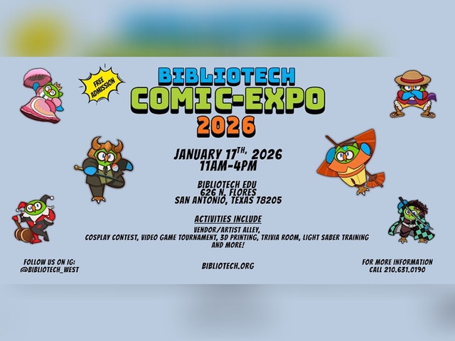 WELCOME TO BIBLIOTECH COMIC-EXPO 2025! Come join us for a day filled with your favorite comics, artists, and cosplayers! Get ready to immerse yourself in the vibrant world of pop culture! Explore the exhibitor booths for unique finds, join our video game tournament, participate in our cosplay contest, and more! Whether you're a seasoned con enthusiast or just curious about this fascinating world, BiblioTech Comic-Expo 2025 has something for everyone. So, grab your friends and unleash your inner superhero at this amazing event! Don't miss out on this opportunity to celebrate all things pop culture! See you there! For more information visit bibliotech.org or give us a call at 2106310190.