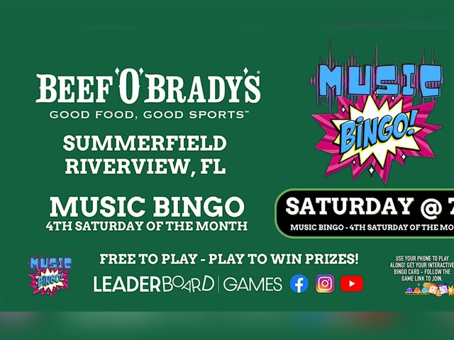 Beef 'O' Brady's - Summerfield Riverview FL hosts Music BINGO Game Night on 4th SATURDAY of every Month at 7p - Join us for great music, food, fun and PRIZES! Use your phone to get your Music BINGO Game Card - FREE to Play but you have to Play to WIN PRIZES! Music Bingo is a twist on the traditional game of bingo, where instead of numbers, we'll be playing a great mix of your favorite song clips! The Game Host will play a variety of songs and you'll mark off the corresponding squares on your bingo card. There will be prizes for the winners and plenty of opportunities to sing and dance along to the music. π€πΊπ Use your phone to play and get your Music BINGO Card! This event is completely FREE to attend and includes one bingo card per person. Don't miss out on the fun! See you there! π PRIZES mix may include a fun variety! #MusicBingo #GameNight #MusicFun #BingoParty #MusicMania #BingoBash #TunesAndBingo #MusicalBingo #BingoNight #SoundtrackBingo #bingo #music #freetoplay #beefobradys #riverivew #FL #Florida #tampabay #LeaderBoardGames