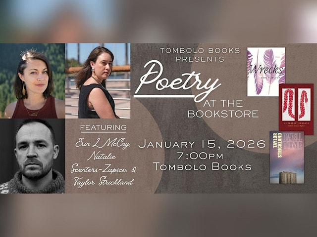 Tombolo Books welcomes three incredible poets to the bookstore for a reading and discussion of their latest collections! This trio includes Erin L. McCoy, Natalie Scenters-Zapico, and Taylor Strickland. McCoy will be reading from her debut collection Wrecks which explores her experiance with dehumanization as an atheist growing up in the conservative South; it also interrogates her complicity in systems of structural racism, and her inheritance as the descendant of colonizers. My Perfect Cognate staggers between English and Spanish, as language becomes Scenters-Zapico’s mirror, reflecting her body, her family, and the borders that confine them. And in his debut collection Dwell Time, Strickland gives us poems that advocate for a world against isolation, one in which we go beyond our own witness to embrace another’s, and shrink the distance between us. Erin L. McCoy’s debut novel, Underlake, is forthcoming from Doubleday in 2026. Her poetry collection, Wrecks, was published by Noemi Press in October 2025 and was a finalist for the Noemi Book Award. Erin’s poetry and fiction have appeared in the American Poetry Review, Best New Poets, Pleiades, Conjunctions, and other publications, and she was a finalist for the Missouri Review’s Miller Audio Prize. Natalie Scenters-Zapico is a fronteriza from El Paso, Texas. Her latest book, My Perfect Cognate, is forthcoming (Copper Canyon Press, September 2025). She is also the author of two previous collections, Lima :: Limón (Copper Canyon Press 2019) and The Verging Cities (Colorado State University 2015). Winner of Yale University’s Windham Campbell Prize (2021), she has held a Ruth Lilly and Dorothy Sargent Rosenberg Fellowship from the Poetry Foundation (2018), a Lannan Literary Fellowship (2017), and a CantoMundo Fellowship (2015). She lives in Tampa and teaches poetry at the University of South Florida. Taylor Strickland is from Tallahassee, Florida. His latest book is Dwell Time (Tapsalteerie, November 2025). His last collection Dastram/Delirium (Broken Sleep Books, 2023) won the Saltire Society Award for Scottish Poetry Book of the Year and was a Poetry Book Society Translation Choice. His poems have been The Scotsman Poem of the Week, shortlisted for several prizes, and translated into Irish and Italian. ‘The Low Road’ was adapted by American composer, Andrew Kohn, and performed in Orkney. 'Nine Whales, Tiree', was adapted to film-poem by filmmaker Olivia Booker and composer Fee Blumenthaler, and later selected for Bloomsday and Glasgow Cathedral festivals, among others. He lives in Dunkeld, Scotland.
