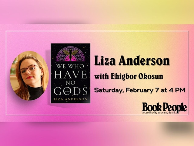 Please welcome Liza Anderson and Ehigbor Okosun to celebrate We Who Have No Gods! This event is free and open to the public. * Start time: 4:00 P.M. * Run time: 45-60 minutes, followed by a signing line. * Location: The second floor of BookPeople. The author will be signing and personalizing copies of the book after the speaking portion of the event. * To get a book signed, a copy of the event book or an item of equal value must be purchased from BookPeople. Guidelines: * Seating will be on a first-come, first-served basis. * If you have any other questions, please visit our Eventbrite FAQ. If your question isn't covered in the FAQ, feel free to email us at online@bookpeople.com. * All event guidelines are subject to change. * BookPeople reserves the right to cancel or postpone this event if necessary. * There will not be a live stream or recording available. About the book: In a world of witches, a human woman must hunt or be hunted in this explosive gothic dark academia fantasy filled with dangerous rivals, guarded secrets, and simmering chemistry. Vic Wood has her priorities: scrape by on her restaurant wages, take care of her younger brother Henry, and forget their mother ever existed. But Vic’s careful life crumbles when she discovers that their long-missing mother belonged to the Acheron Order—a secret society of witches tasked with keeping the dead at bay. What’s worse, Henry inherited their mother’s magical abilities while Vic did not, and he has been chosen as the Order’s newest recruit. Determined to keep him safe, Vic accompanies Henry to the isolated woods in upstate New York that host the sprawling and eerie Avalon Castle. When she joins the academy despite lacking powers of her own, she risks not only the Order’s wrath, but also her brother’s. And then there is the imposing, ruthless, and frustrating Xan, the head Sentinel in charge of protecting Avalon. He makes no secret of wanting Vic to leave. As she makes both enemies and allies in this mysterious realm, Vic becomes caught between the dark forces at play, with her mother at the heart of it all. What’s stranger is that Vic is beginning to be affected by the academy—and Xan—in ways she can’t quite understand. But with war between witches threatening the fabric of reality, Vic must decide whether to risk her heart and life for a world where power is everything. About the author: Liza Anderson is a recent graduate of Yale Law School and a not-so-recent graduate of the University of Texas, where she was the editor in chief of The Daily Texan. She has a background in media law and journalism, including bylines in The Dallas Morning News. She lives in Austin with her partner, cats Lyndon and Lady Bird, and a small army of houseplants. We Who Have No Gods is her first novel. About the moderator: Ehigbor Okosun, or just Ehi, is the #1 International Bestselling author of FORGED BY BLOOD, the first in an action-packed adult epic fantasy duology. Raised across four continents, she now resides in the US, where she writes speculative fiction, mystery thrillers, and contemporary novels for adult and YA audiences. She writes in hopes of doing justice to the myths and traditions she grew up steeped in, and to honour her large, multiracial and multiethnic family. She is a graduate of UT Austin with degrees in Plan II Honors, Neurolinguistics, and English, as well as Chemistry and Pre-Medical studies. When she’s not reading, you can catch her bullet journalling, gaming, baking, singing, doing yoga and spending time with her loved ones. By purchasing a book from BookPeople, you are not only supporting a local, independent business – you’re showing publishers that they should continue sending authors to BookPeople. Thank you for supporting Liza Anderson, Ehigbor Okosun, and your local independent bookstore!
