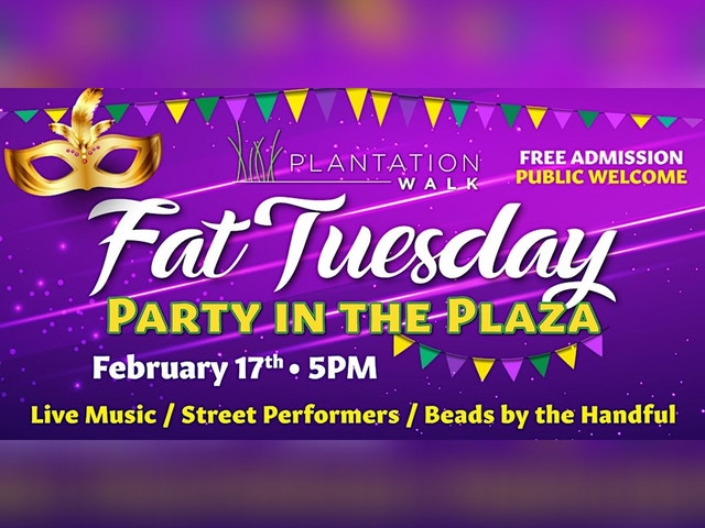 TUESDAY, FEBRUARY 17TH BEGINNING AT 5PM JOIN PLANTATION WALK FOR OUR FAT TUESDAY PARTY IN THE PLAZA & MARDI GRAS CELEBRATION! Gather your friends, and Join Us at the Plantation Walk Plaza for a night of Non-Stop Live Music & Fun... as we "Let the Good Times Roll" - "Laissez les bons temps rouler"!! * The "Apostoli Floyd Experience" Live * Deejay "ViVi" * Beads by the Handful * Mardi Gras Stilt Walkers * Craft Vendors * Food & Beverage Specials at Participating Venues and More! FREE ADMISSION & FREE PARKING / PUBLIC WELCOME Over 20 Restaurants, Specialty Shops, and Experiences Rain or Shine No Outside Food or Beverage Permitted NOTICE: ONLY RSVPs or TICKETS PURCHASED THROUGH THE EVENTBRITE PLATFORM WILL BE HONORED. THERE ARE NO AUTHORIZED THIRD PARTY TICKETING PLATFORMS.