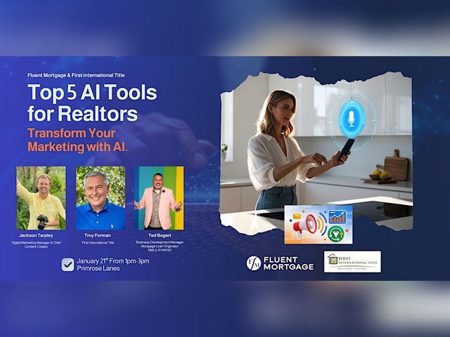 TOP 5 AI TOOLS FOR REALTORS! Ready to up your real estate game? Join us in person to discover the Top 5 AI Tools every realtor needs. Whether you're looking to boost efficiency, find leads faster, or close deals smarter, this event's got you covered. Don't miss out on learning how tech can work for you in the real estate world. Come hang out, learn, and get inspired! Presented by Jackson Tarpley with First International Title Hosted by: Troy Forman with First International Title Ted Bogert with Fluent Mortgage