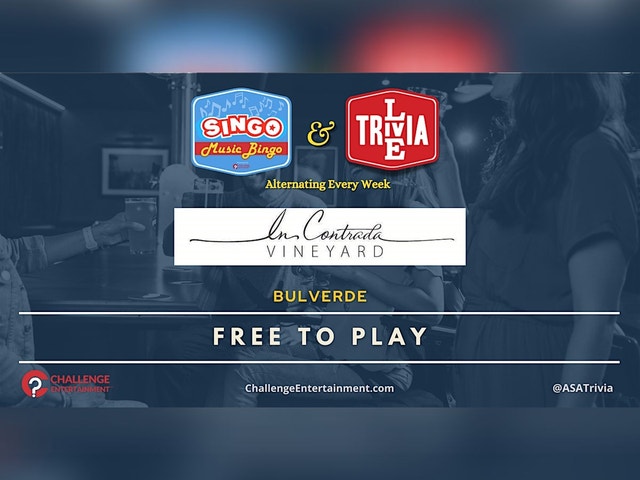 SAN ANTONIO/BULVERDE - 2 GREAT CE GAME NIGHTS A MONTH Get ready for double the fun — two Game Nights EVERY MONTH at In Contrada Vineyard and Kitchen starting 10/3! Here’s how it works: -1st FRIDAY of every month – Singo Music Bingo- 3rd FRIDAY of every month – Live Trivia Join us at 7:00PM for a rotating lineup of games that bring the energy, the laughs, and the prizes. Whether you're testing your brain or matching your favorite songs, it’s always #Free to play and packed with fun. Grab your crew, mark your calendars, and don’t miss a single Game Night! #ASATrivia powered ChallengeEntertainment.com for a #BetterNightOut @Incontradavineyard #MusicBingo #BingoInSanAntonio #BingoNearMe #FridayBingo #Trivia #WhatToDoTonight In Contrada Vineyard and Kitchen - 27490 Smithson Valley Rd., San Antonio, TX