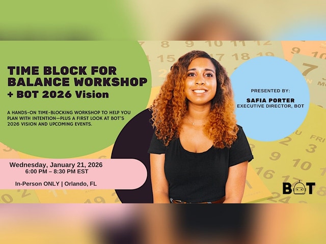 2026 is a pivotal year for BOT—and we’re starting it by helping you take control of your time with clarity, structure, and balance. Time Block for Balance Workshop + BOT 2026 Vision & Upcoming Events is a practical, interactive session designed for professionals, founders, and community members who want to move into the new year with intention—not overwhelm. During this workshop, you’ll learn how to: * Build realistic time blocks that support both work and life * Protect your energy and avoid burnout * Create weekly structures that actually stick * Use simple tools and frameworks you can reuse all year In addition to the workshop, we’ll share a special preview of BOT’s 2026 vision, including: * Upcoming workshops and programs * Key community events planned for the year * Ways to stay engaged as BOT enters its next chapter This event is equal parts practical planning and forward-looking insight, giving you tools you can use immediately and clarity on what’s ahead. WHO SHOULD ATTEND * Professionals balancing demanding schedules * Founders and entrepreneurs * Career switchers and upskillers * Anyone seeking structure, focus, and balance in 2026 WHAT YOU’LL WALK AWAY WITH * A personalized time-blocking framework * Clear next steps for planning your year * Practical tools you can reuse week after week * Early insight into BOT’s 2026 roadmap and events