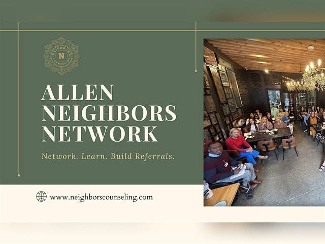 ALLEN NEIGHBORS NETWORKING EVENT Welcome Allen Neighbors! Join us for a fun networking event at Armor Brewing Co from11:00 AM to 1:00 PM (Central Time) on the second Thursday of each month. Connect with fellow mental helath professionals, share resources, and build referrall partners in a casual setting. Don't miss this opportunity to expand your network and enjoy some great treats! See you there! Venue: Armor Brewing Co, 9 Prestige Cir, Allen, TX 75002 Time: 11:00 AM - 1:00 PM Date: Second Thursday of each month PLEASE RSVP using the link below: https://www.neighborscounseling.com/event