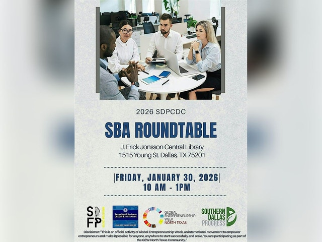 Join local entrepreneurs, small business owners, and community partners for an engaging SBA Roundtable focused on resources, opportunities, and real-world insights to help your business start, grow, and scale. Hosted at the J. Erik Jonsson Central Library in Downtown Dallas, this interactive roundtable brings together experts and advocates from the small business ecosystem to discuss funding, technical assistance, and support programs available to entrepreneurs in North Texas. This event is part of Global Entrepreneurship Week – North Texas and is designed to foster collaboration, learning, and meaningful connections among business leaders and aspiring entrepreneurs. What to Expect: * Open roundtable discussion with SBA and small business partners * Insights on small business resources, funding, and support programs * Networking with fellow entrepreneurs and community organizations * Actionable guidance you can apply to your business immediately