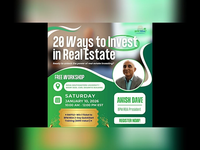 Whether you’re brand new to real estate or looking to scale your existing portfolio, this workshop is your chance to get ahead of the curve and start the year with real momentum. Led by Anish Dave — investor, mentor, and CEO of BPM REIA with over $250M in closed deals — this session delivers the real-world knowledge and battle-tested strategies you need to build wealth in 2026 and beyond. This is not theory. It’s a hands-on, high-value training designed to give you 20 powerful ways to break into or level up in real estate — regardless of your experience or budget. What You’ll Learn: · Creative ways to invest with little or no money down · How to find and analyze cash-flowing deals · Strategies to build long-term passive income · Tax benefits savvy investors use · Smart risk management and ROI-boosting tactics You’ll leave with a practical, plug-and-play roadmap — 20 proven investing methods you can start using immediately. LOCATION: Nova Southeastern University | Room 3030, Carl DeSantis Building BONUS RAFFLE: Win 1 Ticket to the BPM REIA 2-Day QuickStart Training ($895 Value!) This exclusive event offers deep-dive mentorship and actionable tools to fast-track your investing success. Attend live for a chance to win! Spots are limited. Secure your seat now at BPMREIA.com Start strong. Invest smart. Make 2026 your breakthrough year. Register using the link below: https://bpmreia.memberflow.com/event/register/5473 [https://bpmreia.memberflow.com/event/register/5473]