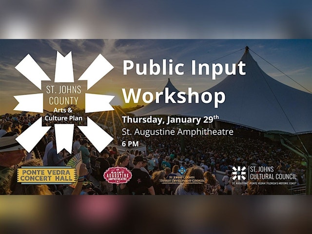 SHARE YOUR IDEAS TO SHAPE THE CREATIVE AND ECONOMIC FUTURE OF ST. JOHNS COUNTY The St. Johns Cultural Council is developing a Cultural Plan that will guide and shape the future of arts, culture, and heritage in our community. The first - and most important step – is gathering community input. We hope you’ll join us to share your thoughts on how we continue to grow the creative economy in St. Johns County. Public input sessions will be held on Tuesday, January 27th at the Ponte Vedra Concert Hall, AND Thursday, January 29th at The Amp. Doors open at 5:30 PM Sessions begin promptly at 6 PM Pre-registration is required. Capacity at both venues is limited. This is an hour-long interactive presentation by Designing Local, a national thought leader in public art and cultural plans. Audience members will use their smartphones to respond and react to the presentation in real time. There will also be opportunities to share your thoughts on a variety of topics related to public art and cultural tourism before and after the program. For more information about the development of these plans and to take the online survey, visit stjohnsculture.com [https://stjohnsculture.com/st-johns-county-arts-culture-plan/] The development of county-wide public art and cultural tourism plans is supported by the St. Johns County Tourism Development Council and the St. Johns County Community & Destination Development Department. Public input sessions are made possible thanks to a partnership with SJC Cultural Events, operators of the Ponte Vedra Concert Hall and the St. Augustine Amphitheatre.