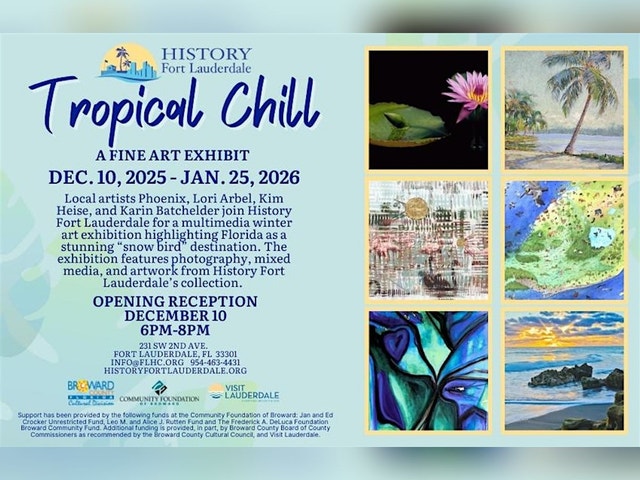 History Fort Lauderdale, committed to preserving our collective heritage, promoting historical literacy, and fostering a sense of pride and stewardship for the vibrant tapestry of our region’s history, will present “Tropical Chill,” a contemporary fine art exhibit that captures the serene spirit and coastal hues of South Florida’s mild winter season. The exhibit, on view from Wednesday, December 10, 2025, through Sunday, January 25, 2026, will showcase paintings, mixed media, and photography by celebrated local artists Phoenix, Lori Arbel, Kim Heise, and Karin Batchelder, along with select works and photographs from History Fort Lauderdale’s permanent collection. The exhibition will open with a free artist meet-and-greet reception and preview on December 10, from 6 p.m. to 8 p.m., at the New River Inn (231 Southwest Second Avenue). The “Tropical Chill” exhibition captures the cheerful spirit of South Florida’s winter when the days are bright, breezy, and full of color. The exhibit brings together local artists who find inspiration in nature, emotion, and everyday life. Their paintings, photography, and mixed media pieces share stories of reflection and transformation, each one shaped by the beauty and rhythm of our region.