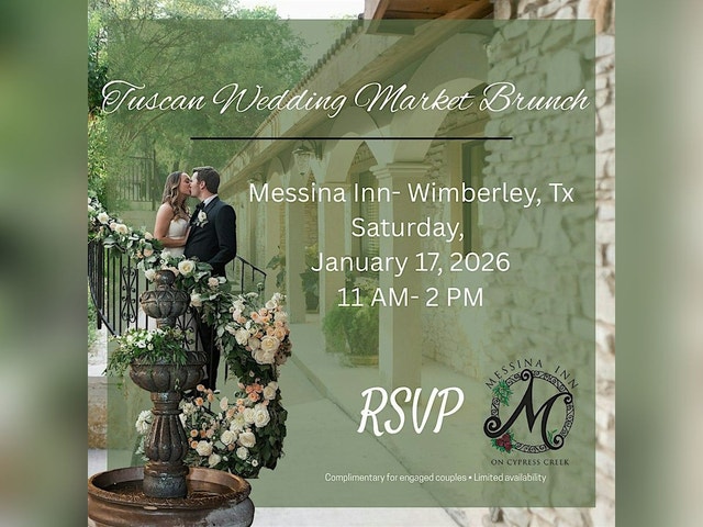 Engaged couples are invited to experience Messina Inn through a relaxed, European-inspired morning designed to help you envision your wedding weekend here.Join us for a Tuscan Wedding Market Brunch, where Italian-villa charm meets curated wedding inspiration. Stroll our property, sip and sample elevated brunch bites, and explore thoughtfully styled spaces that showcase how your celebration could unfold—from welcome moments to ceremony and reception settings.This open house is intentionally intimate and experiential, allowing you to explore at your own pace, connect with our team, and truly feel what a wedding at Messina Inn is like.What to Expect: Delicious Brunch from our catering team Bubbly, coffee, and warm winter sips Walk-through of Messina Inn’s weekend wedding experience Styled ceremony and reception vignettes Select local wedding vendors Time to explore guest rooms, courtyard spaces, and grounds Wedding Retail Market Who Should Attend: Engaged couples actively searching for a wedding venue.Couples planning a weekend or destination-style wedding.Those drawn to Italian-villa, Hill Country, and experience-driven celebrations. Complimentary for engaged couples RSVP required | Limited availabilityRSVP Required to be entered into our door prize drawing and more FUN! link in comments!We look forward to welcoming you for a beautiful winter morning at Messina Inn.