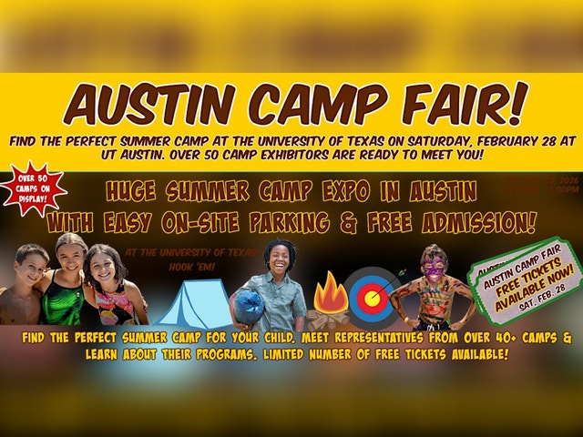 Looking for a camp, school or program for your kids this summer? Don't miss the Austin Camp Fair! With over 50 camps on display, it's a "One-Stop-Shop" to find the best camp for you! Space is limited, so reserve your FREE tickets today! WHAT IS THE AUSTIN CAMP FAIR? The Austin Camp Fair [https://www.coasttocoastcampfairs.com/austin-camp-fair.html] is a free, live, interactive summer camp expo event taking place Saturday, February 28 the University of Texas in Austin, TX. More than 50 summer day camps, overnight camps, specialty camps and more are exhibiting their programs at this free, informative summer camp expo event. Admission is FREE and you'll discover an array of amazing day, overnight, and specialty summer camp opportunities all in one place. If you live in the Austin area and you're looking for the perfect program for your child this summer, you can't afford to miss this free event. It's the easiest and most convenient way to find the perfect camp for your child. Instead of spending time calling and emailing all the camps that interest you one-by-one, you can meet and speak with representatives from all of them at the same time at the Austin Camp Fair! * Meet representatives from over 50 camps and programs and get all your questions answered * Experience sample games and activities from the camps for a taste of what summer camp is all about * Get free brochures and videos from all the camps * Games, prizes, and activities for the kids * Raffles, drawings and free camp session giveaways * Food and fun * It's all FREE! FAQS Are there ID or minimum age requirements to enter the event? No! The summer camps and programs exhibiting at the Camp Fair serve kids and teens from the ages of 3 to 17. That means nobody is too young or too old to attend the Camp Fair because no matter your child's age, you're bound to find the perfect camp for you. Bring your whole family because it's gonna be a great day! What are my transportation/parking options for getting to and from the event? * Parking Options: Parking information will be provided as the event draws closer. How can I contact the organizer with any questions? Feel free to email us at info@coasttocoastcampfairs.com any time. We're easy to reach and quick to respond! How many tickets do we need to get in? Just one ticket admits your whole family. If you are attending the Camp Fair with friends, please ask them to print their own tickets. Does it cost anything to get in? Nope! The whole event is totally free. Just click or tap the "Reserve a spot" button to grab your free admission tickets today. We're looking forward to seeing you February 28 at the Austin Summer Camp Fair and Expo! How can I feature my summer camp at the Austin Camp Fair? If you're interested in showcasing your camp at the Austin Camp Fair, we’d love to have you join us! Simply click here [https://coasttocoastcampfairs.campbrainregistration.com] to access our vendor registration form and secure your spot today!