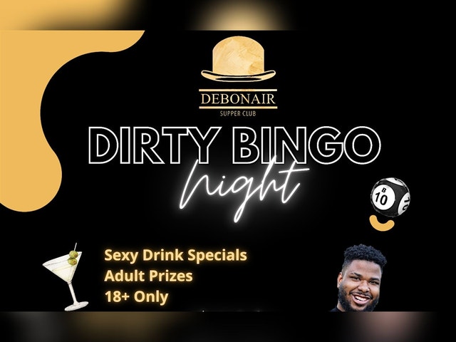 DIRTY BINGO AT DEBONAIR Get ready for a night of laughs and surprises at the Debonair Supper Club! Join us every Wednesday from 8 to 10 PM. for a fun, cheeky twist on classic bingo. Bring your friends, enjoy some good vibes, and see who wins the wildest prizes. It's the perfect way to shake up your day and have a blast in person. Don’t miss out on this unique and hilarious event!